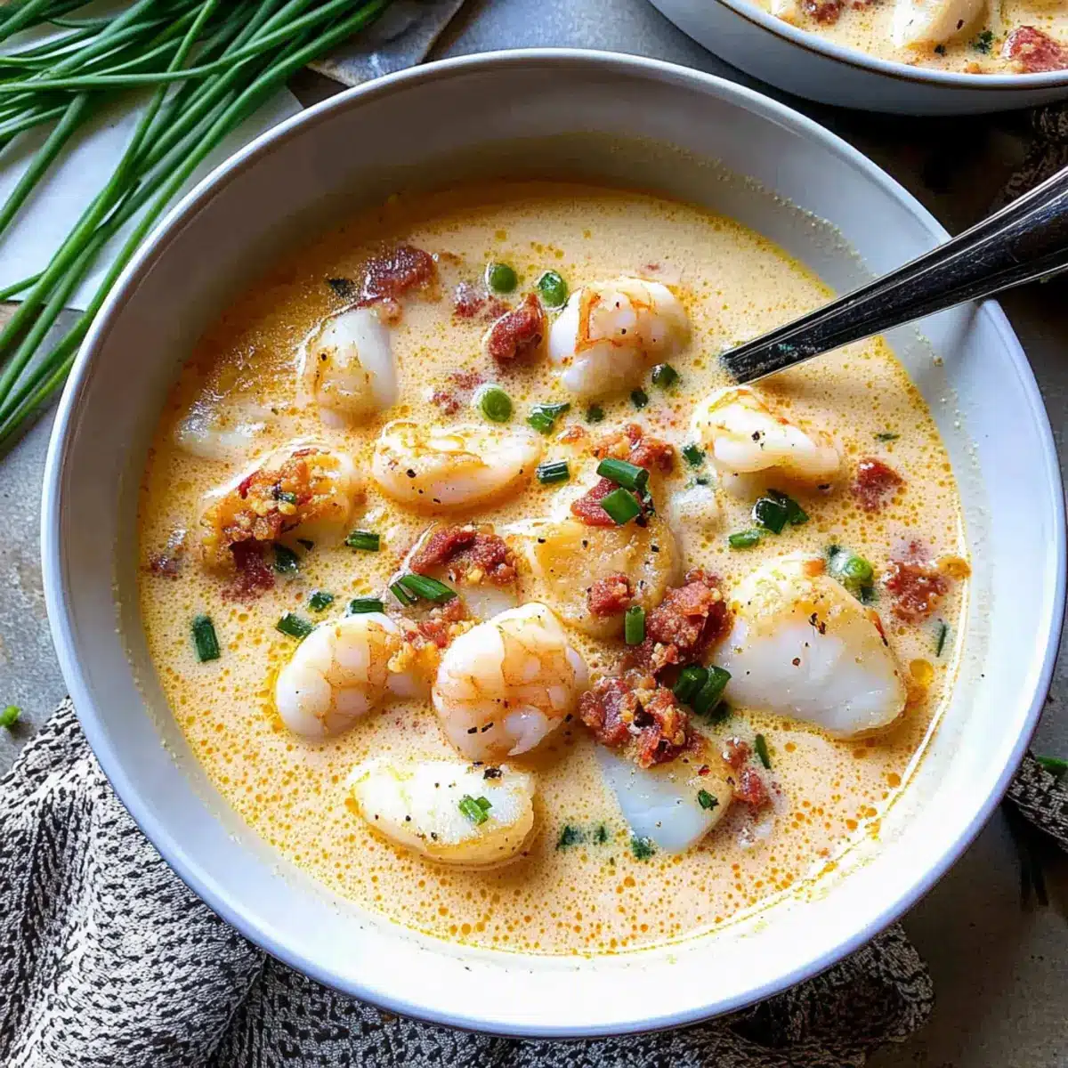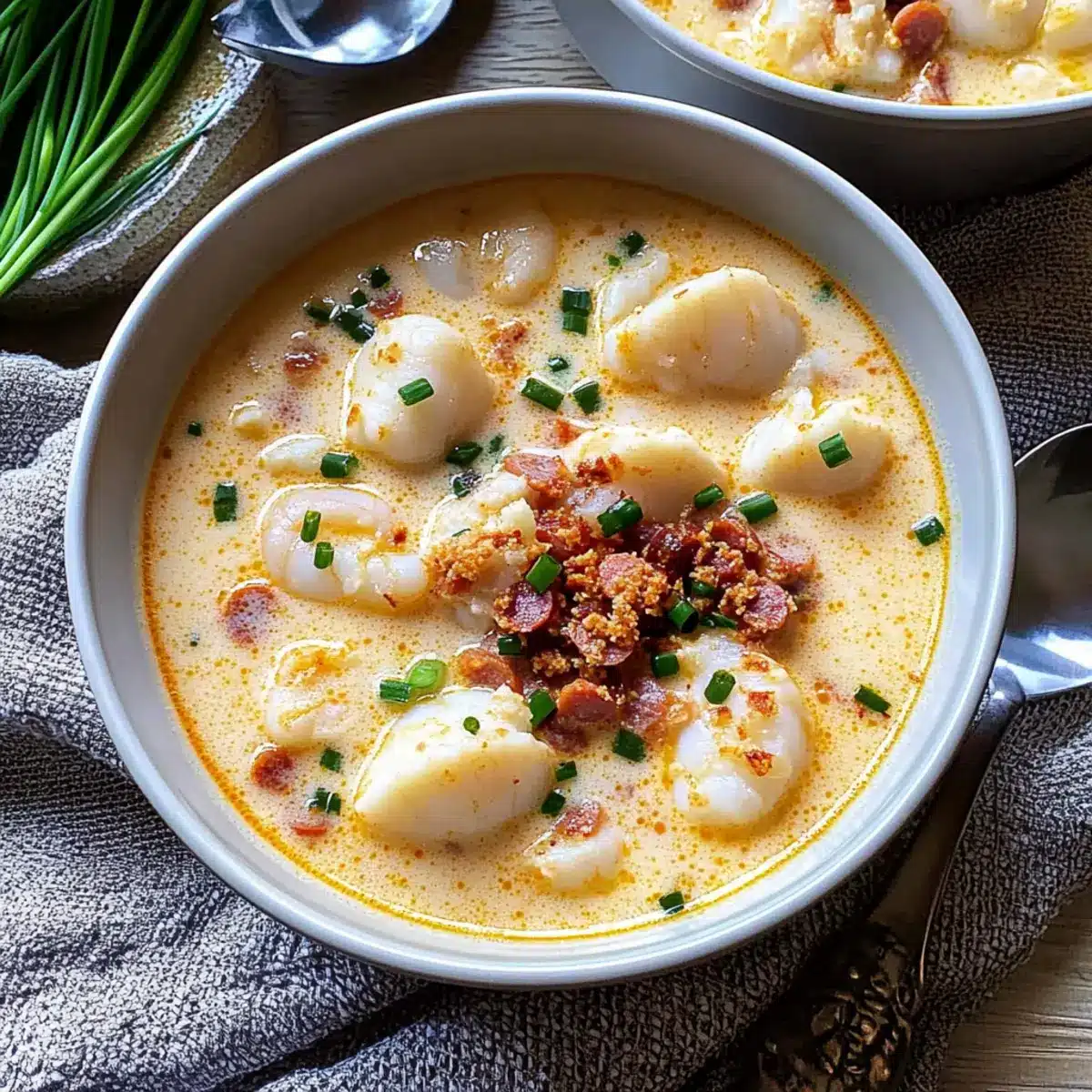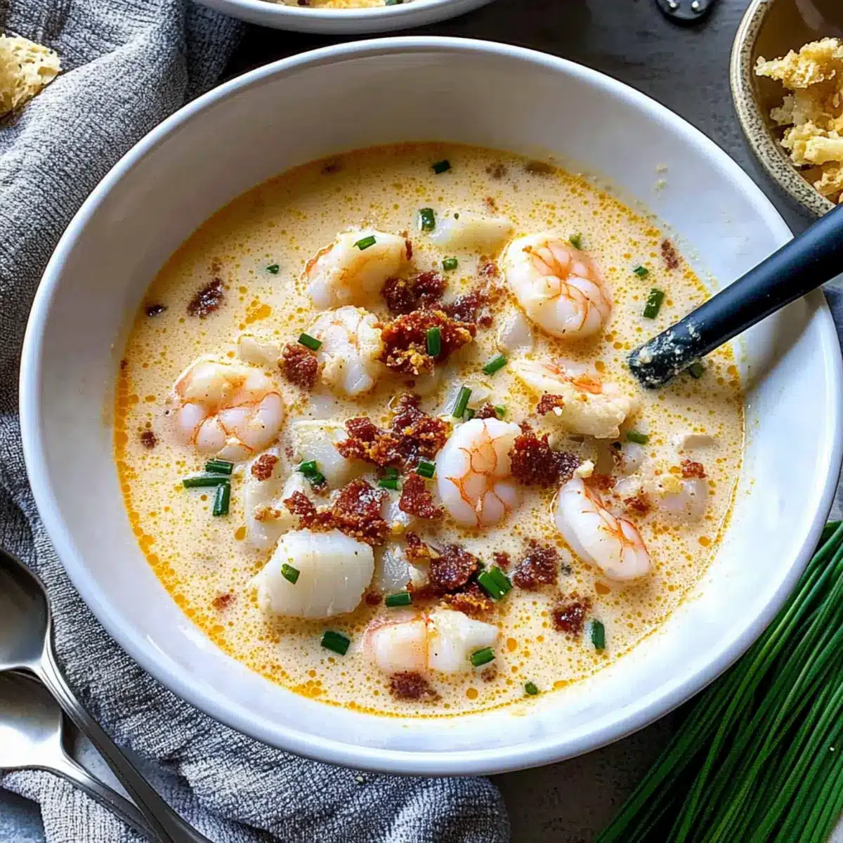 Ladle the chowder into bowls and top each serving with the reserved crispy chorizo crumbles and a sprinkle of finely chopped chives. The contrasting textures and fresh garnish will bring your Blushing Seafood Chowder to life, inviting everyone to dig in immediately!