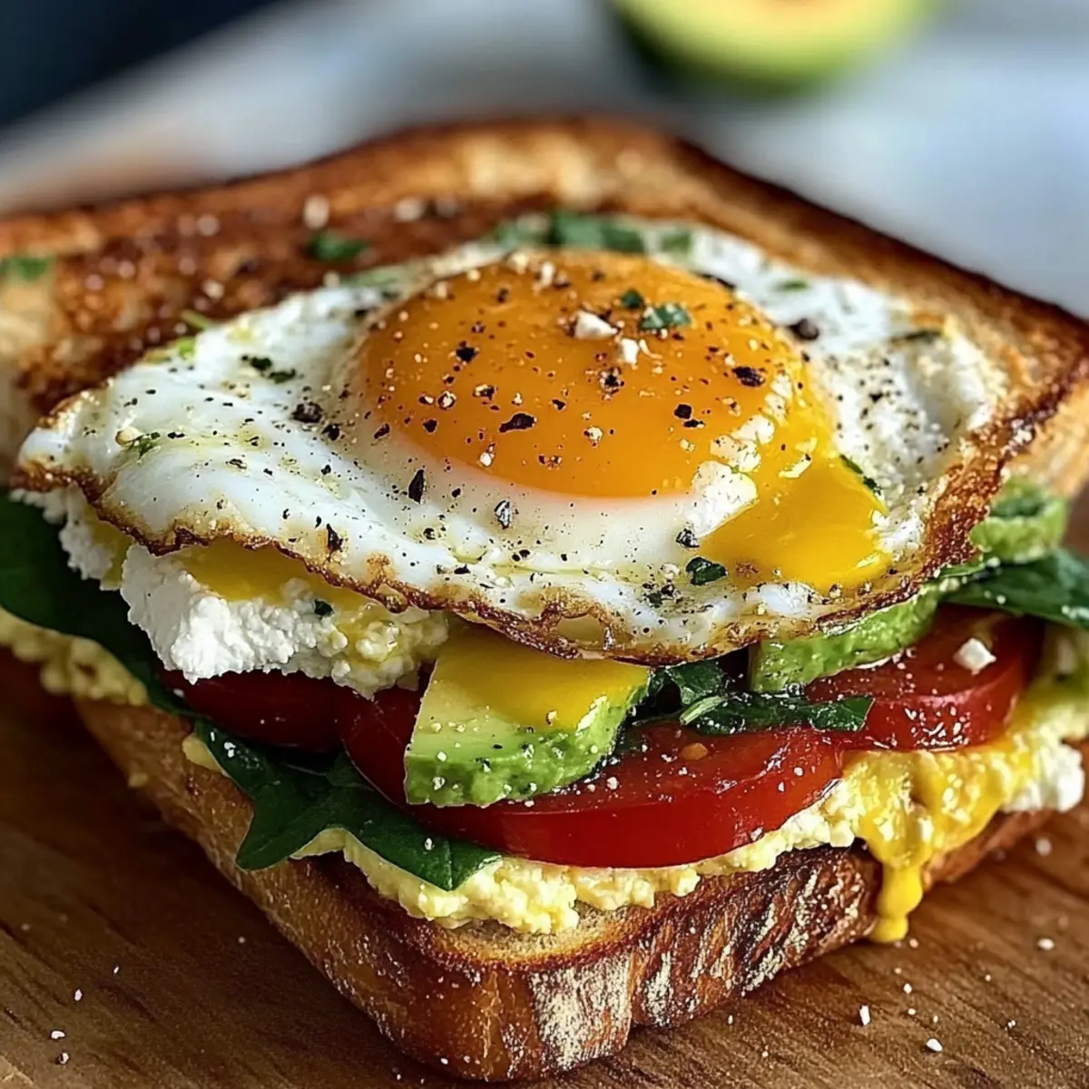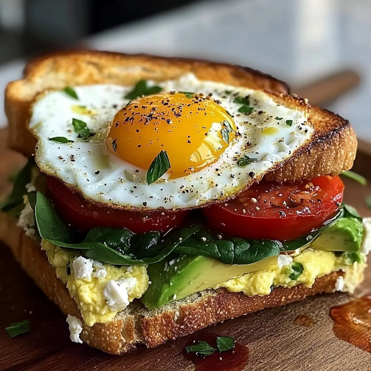 Once all components are ready, start layering. Place a generous handful of fresh spinach on the bottom half of the toasted ciabatta, followed by a layer of juicy tomato slices and creamy avocado. Crumble your feta cheese generously over the veggies to add flavor, and top it all with the perfectly cooked egg.