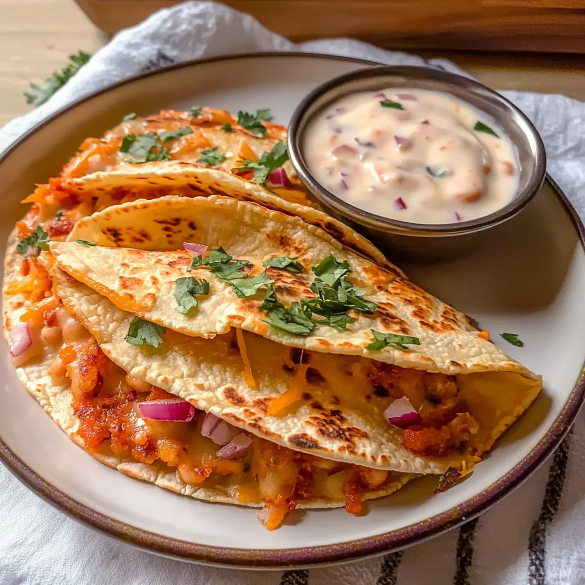 - Assemble the Tacos: Lightly soak each flour taco in the warm bean mixture for a few seconds. Spoon filling onto one side of the taco and sprinkle with shredded cheese. Fold and seal.