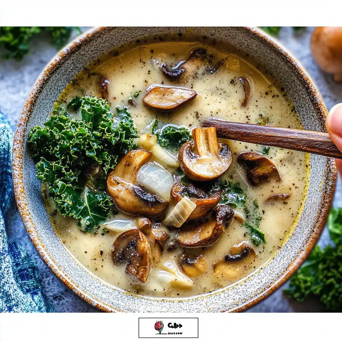Warm Wild Mushroom, Caramelized Onion and Kale Soup Bliss