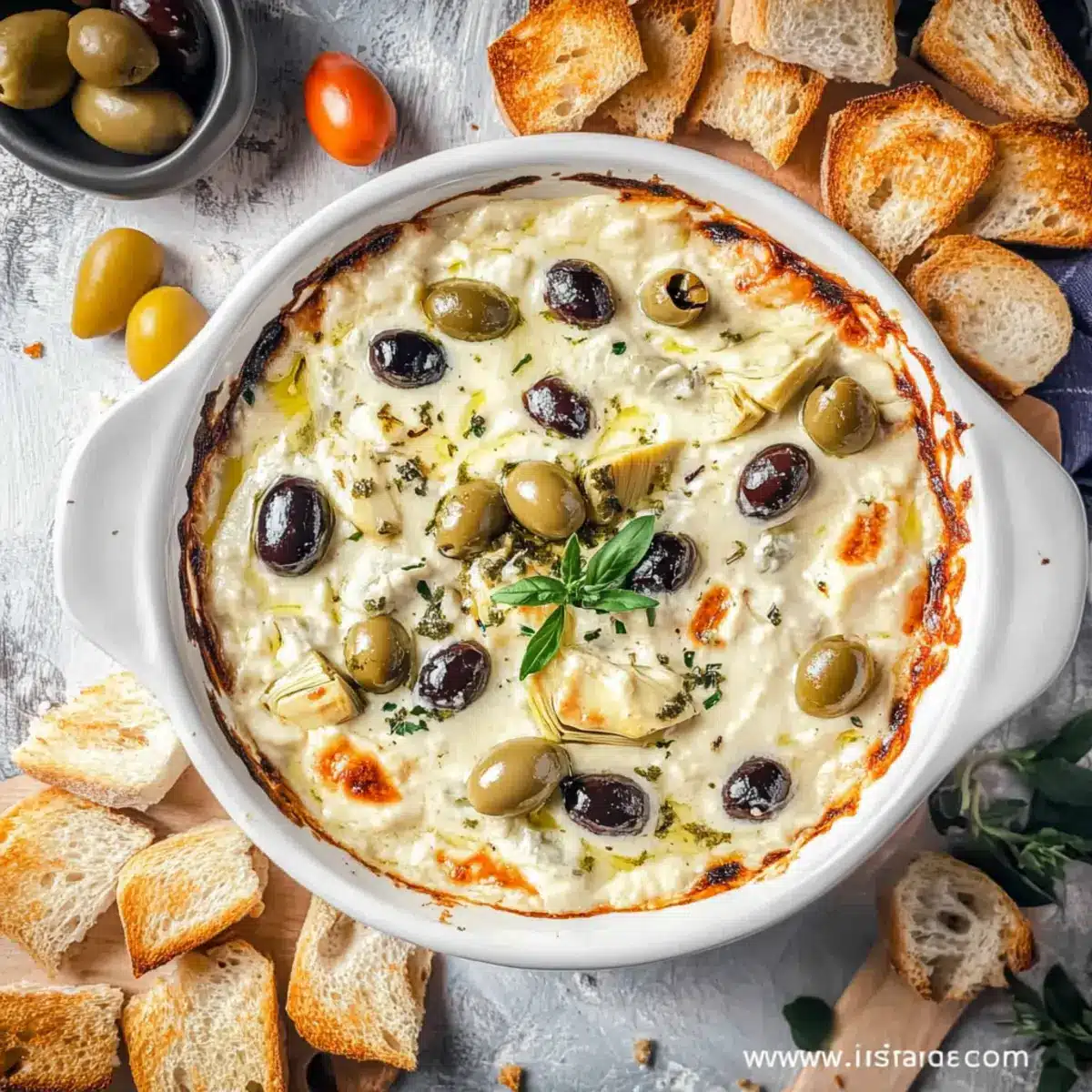 • Crackers or Crostini – Perfect for scooping up that creamy cheesy baked olive dip.