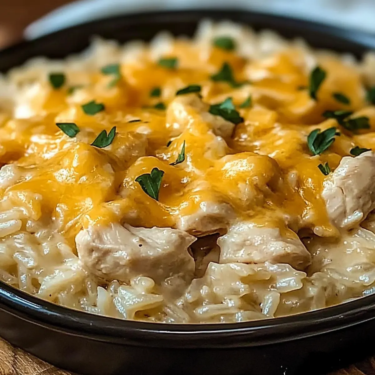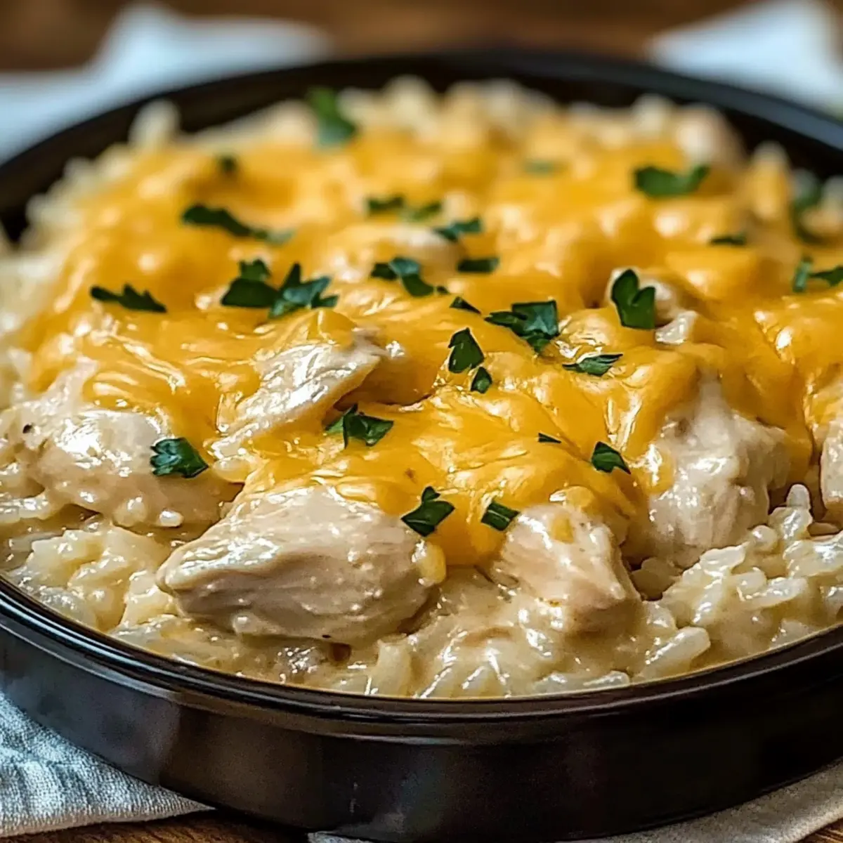 As the aroma of melting cheese mingles with golden-brown chicken wafts through the air, I can’t help but envision cozy nights spent with loved ones. This Cheesy Chicken and Rice dish doesn’t just fill your stomach; it wraps you in warmth and comfort as you savor every bite. One of the best parts? This one-pot meal comes together in no time, making it a lifesaver for busy weeknights or unexpected guests. Plus, it’s easily customizable—add your favorite veggies or switch up the cheese for a fun twist! So, why not dive into this deliciously simple recipe that will soon become a staple? What exciting variations will you try?