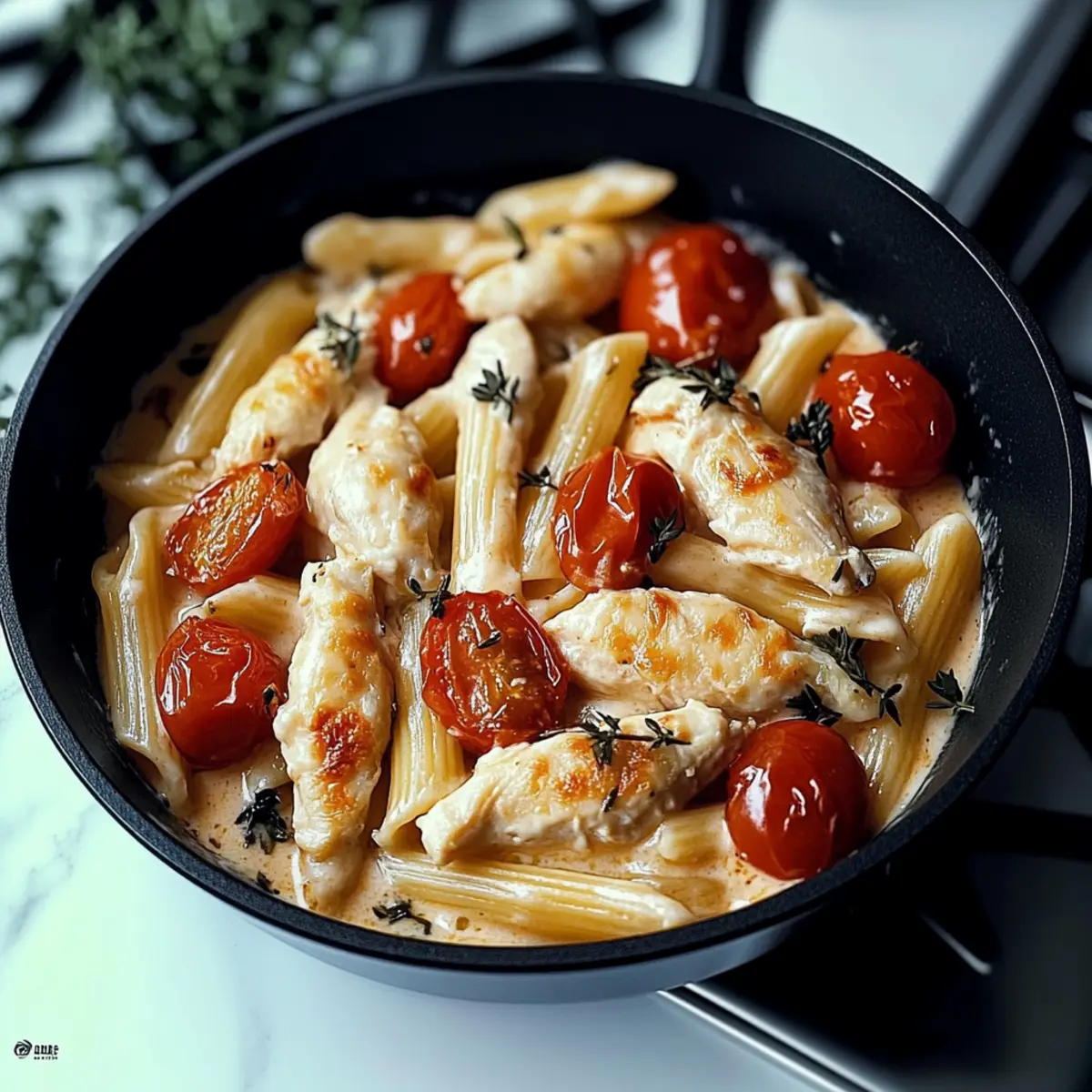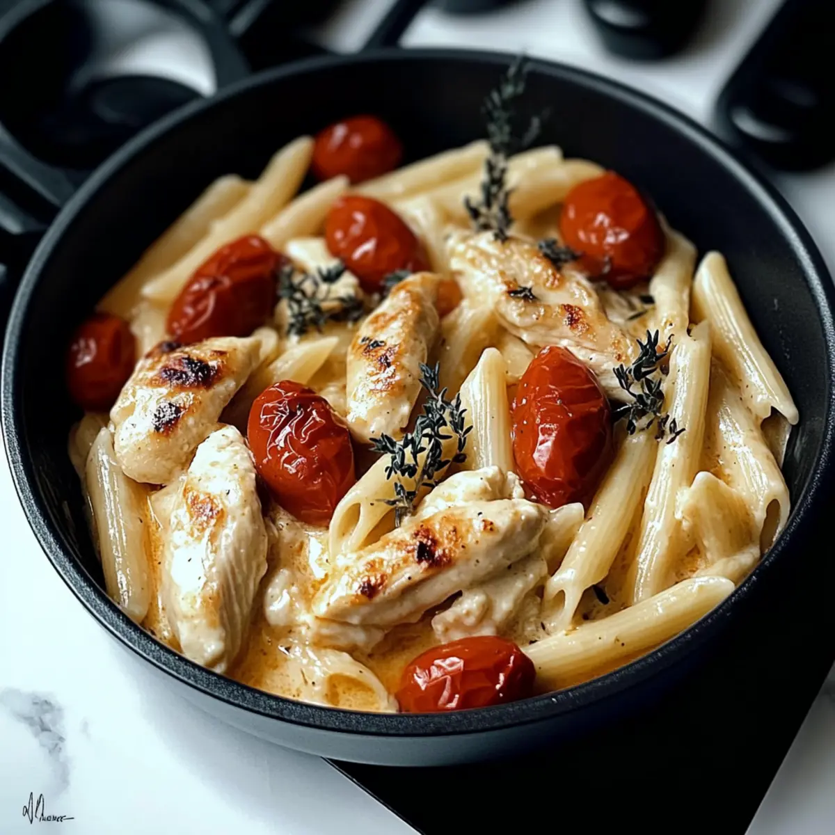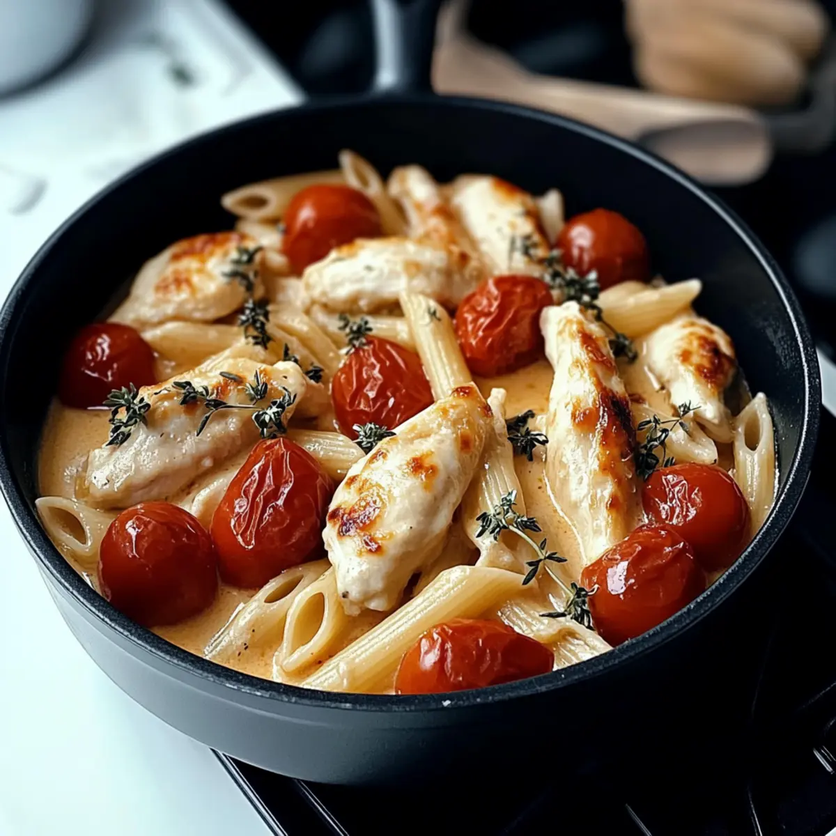 - Add cooked penne pasta to the skillet, tossing to coat completely with sauce.
