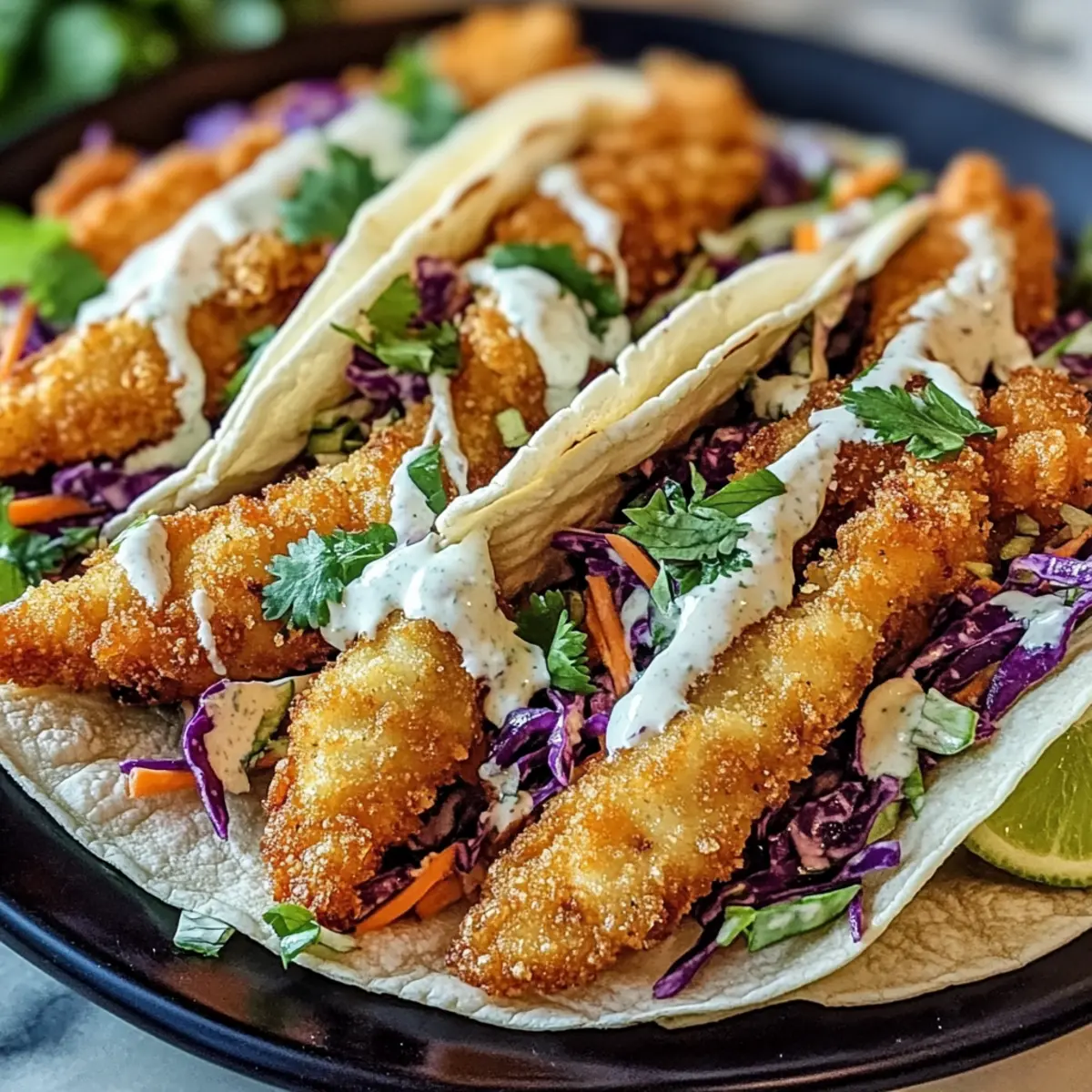- Warm corn tortillas in a skillet or microwave. Layer each with crispy fish, slaw, and lime crema. Garnish with fresh cilantro if desired.