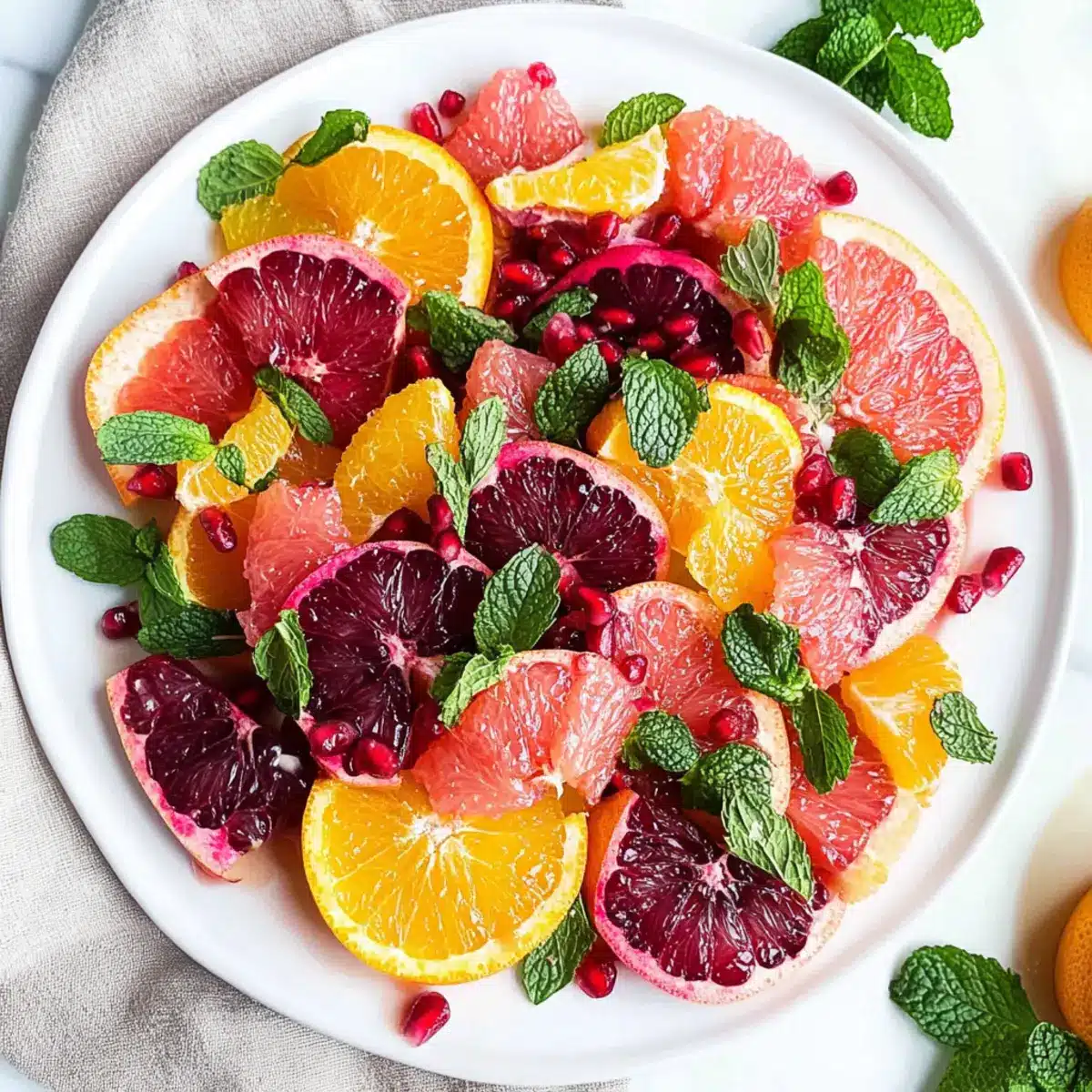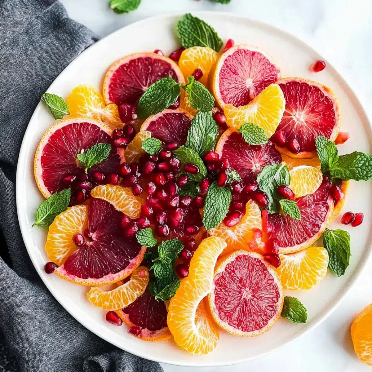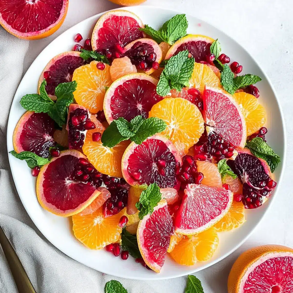 To complete your Easy Citrus Salad, garnish with fresh mint leaves and sprinkle pomegranate arils for added texture and a burst of flavor. The vibrant greens and jewel-like pomegranate pieces will provide a stunning visual contrast. Prepare to serve immediately, appreciating how this salad brightens up any meal with its freshness and color.