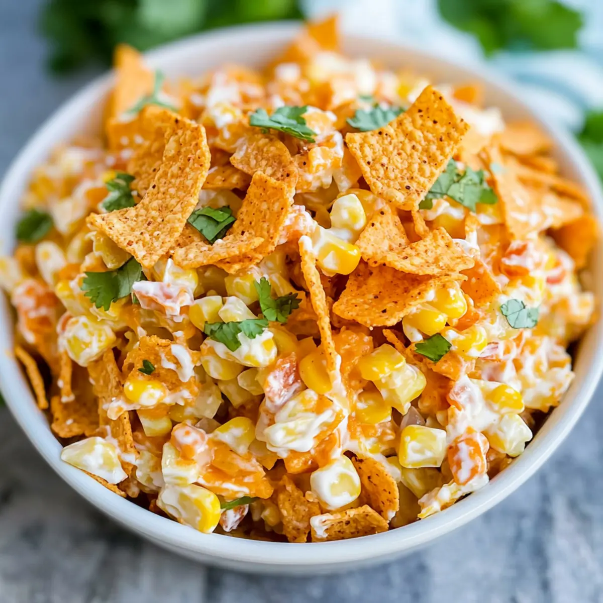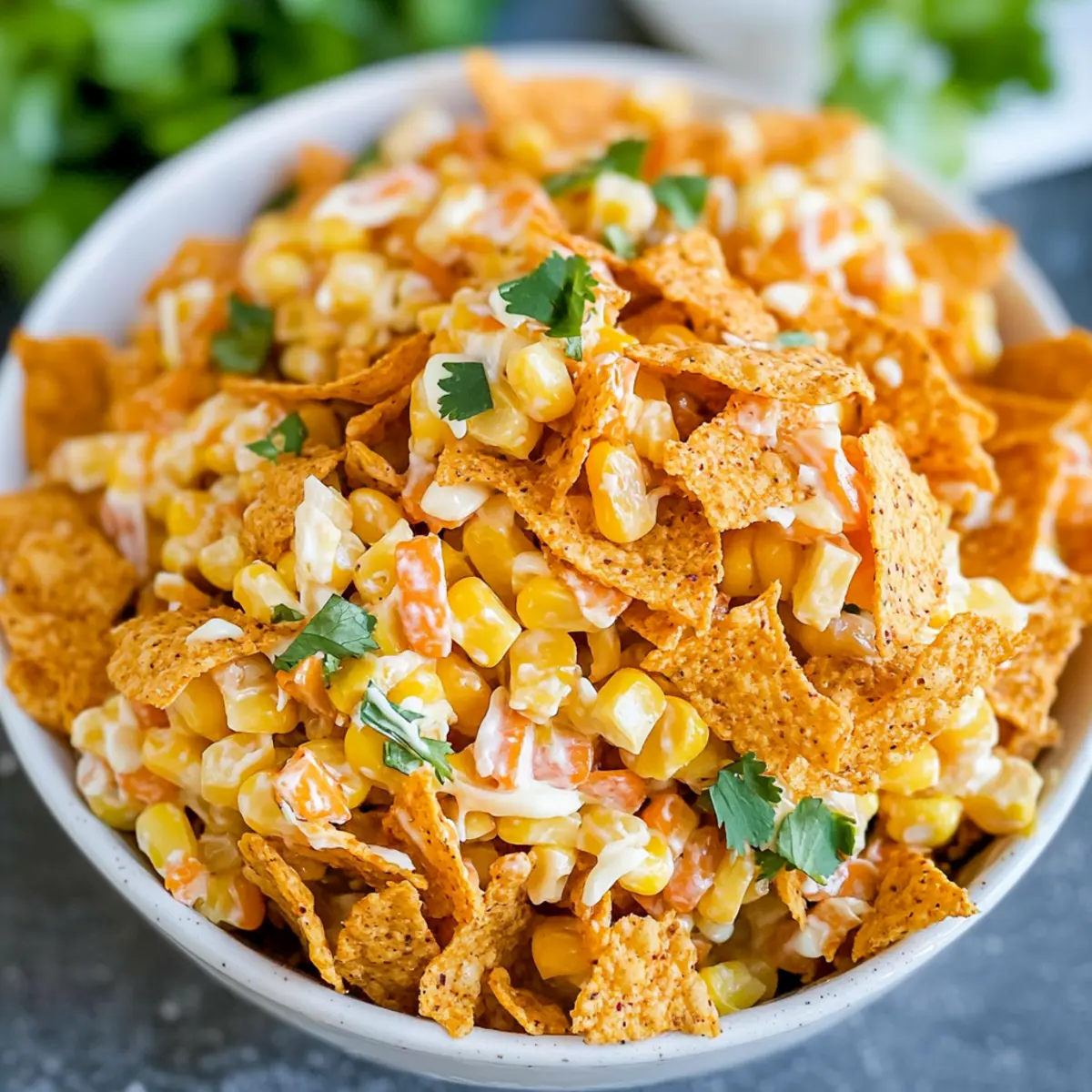 If desired, chop fresh cilantro and sprinkle it over the top of your Fritos Corn Salad for a burst of color and flavor. This garnish adds a fresh touch that elevates the dish. Serve immediately to enjoy the salad’s full crunch and flavor, making it a perfect refreshing side dish for your summer gatherings.