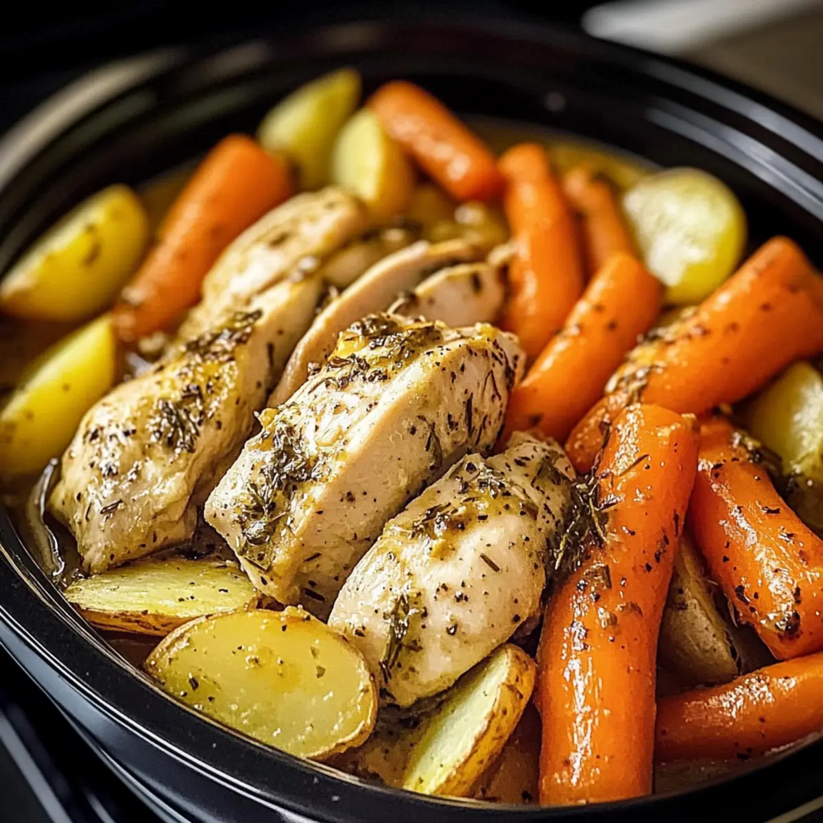Begin by placing the chicken tenderloins in the center of the slow cooker. Then, arrange potato wedges on one side and scatter baby carrots on the other to create a vibrant display of ingredients. This colorful setup not only looks appealing but also ensures even cooking of your Garlic Butter Chicken and Veggies.