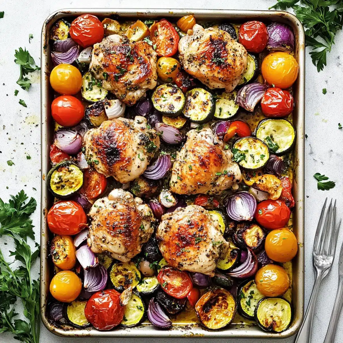While the chicken marinates, prepare your vegetables. On a large baking sheet, spread out slices of zucchini, yellow bell pepper, red onion, and halved cherry tomatoes. Drizzle the remaining marinade over the vegetables, tossing them gently to coat. This step adds a burst of flavor and color to your Greek Sheet Pan Chicken.
