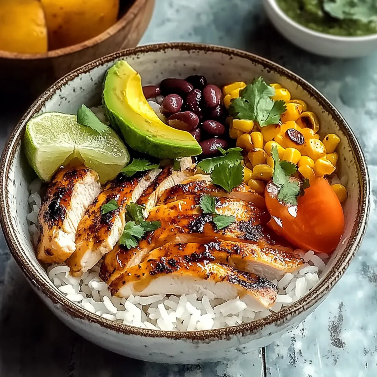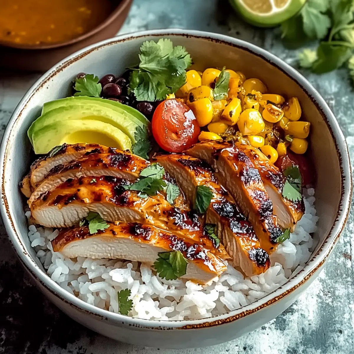 Finally, drizzle the remaining marinade over each bowl for an extra burst of flavor. Garnish with sliced avocado and a sprinkle of fresh cilantro. Include lime wedges on the side for an added zesty touch, and your vibrant Honey Lime Chicken & Rice Bowls are now ready to be enjoyed!