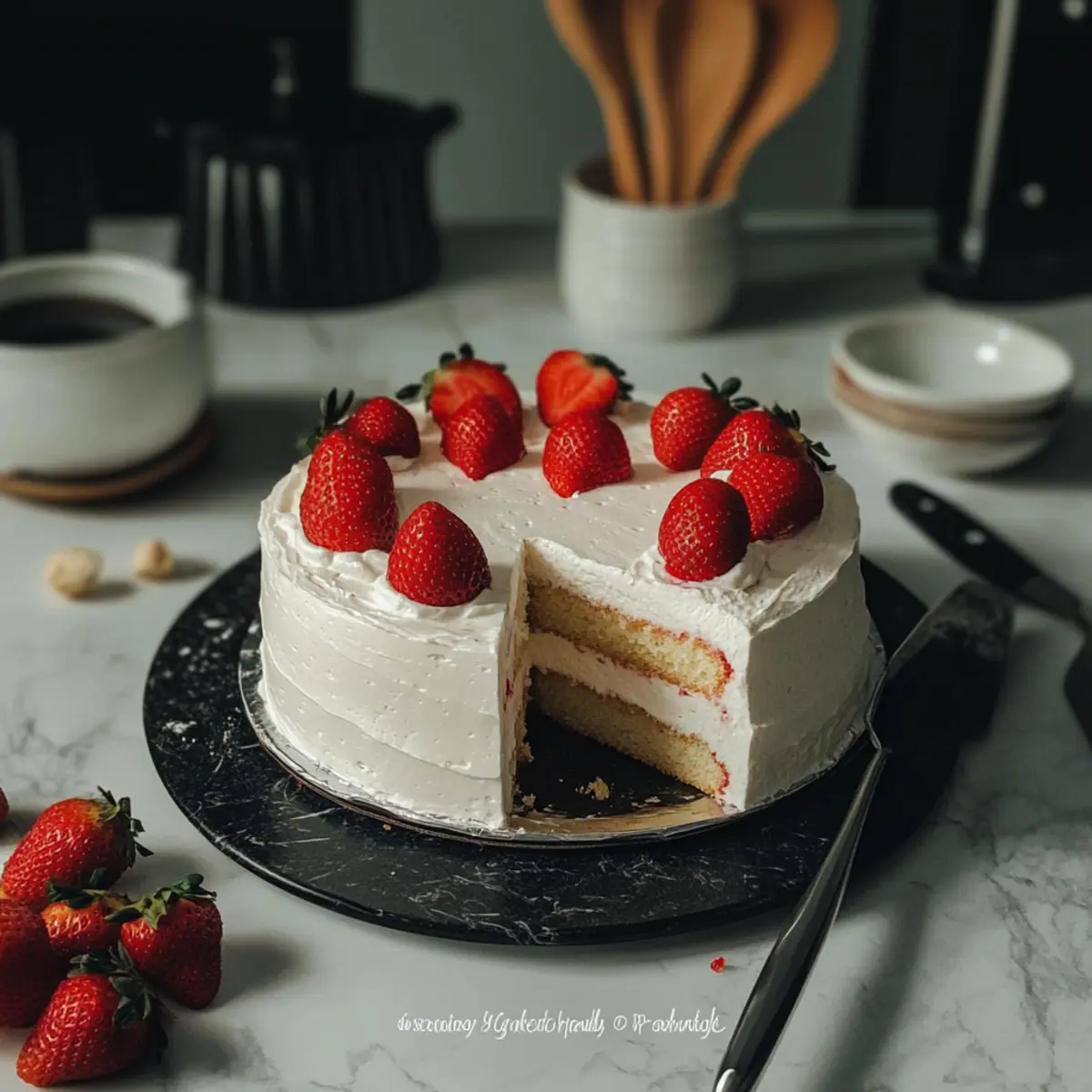 - Frost the assembled cake with remaining whipped cream and top with macerated strawberries.