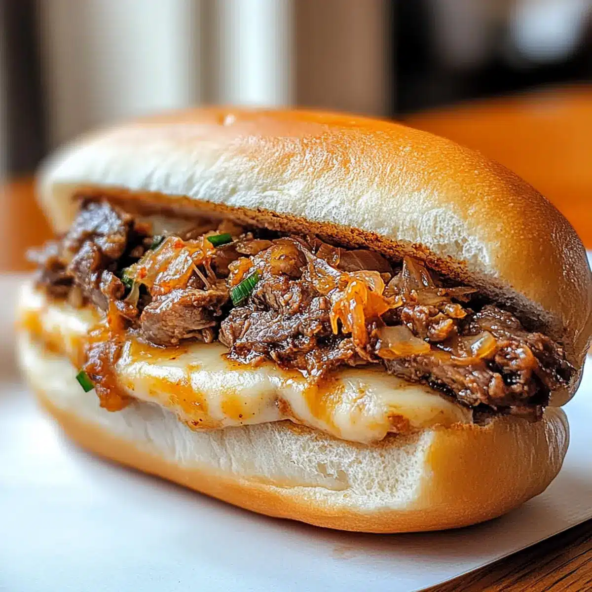 Take your toasted sub rolls and carefully spoon the bulgogi mixture inside, ensuring an even distribution. Top each filled roll generously with cheese of your choice. If you prefer a gooey, melty texture, place the assembled cheesesteaks under the broiler for about 2 minutes, or until the cheese is perfectly melted and bubbling, adding that indulgent touch to your Kimchi Bulgogi Cheesesteak.