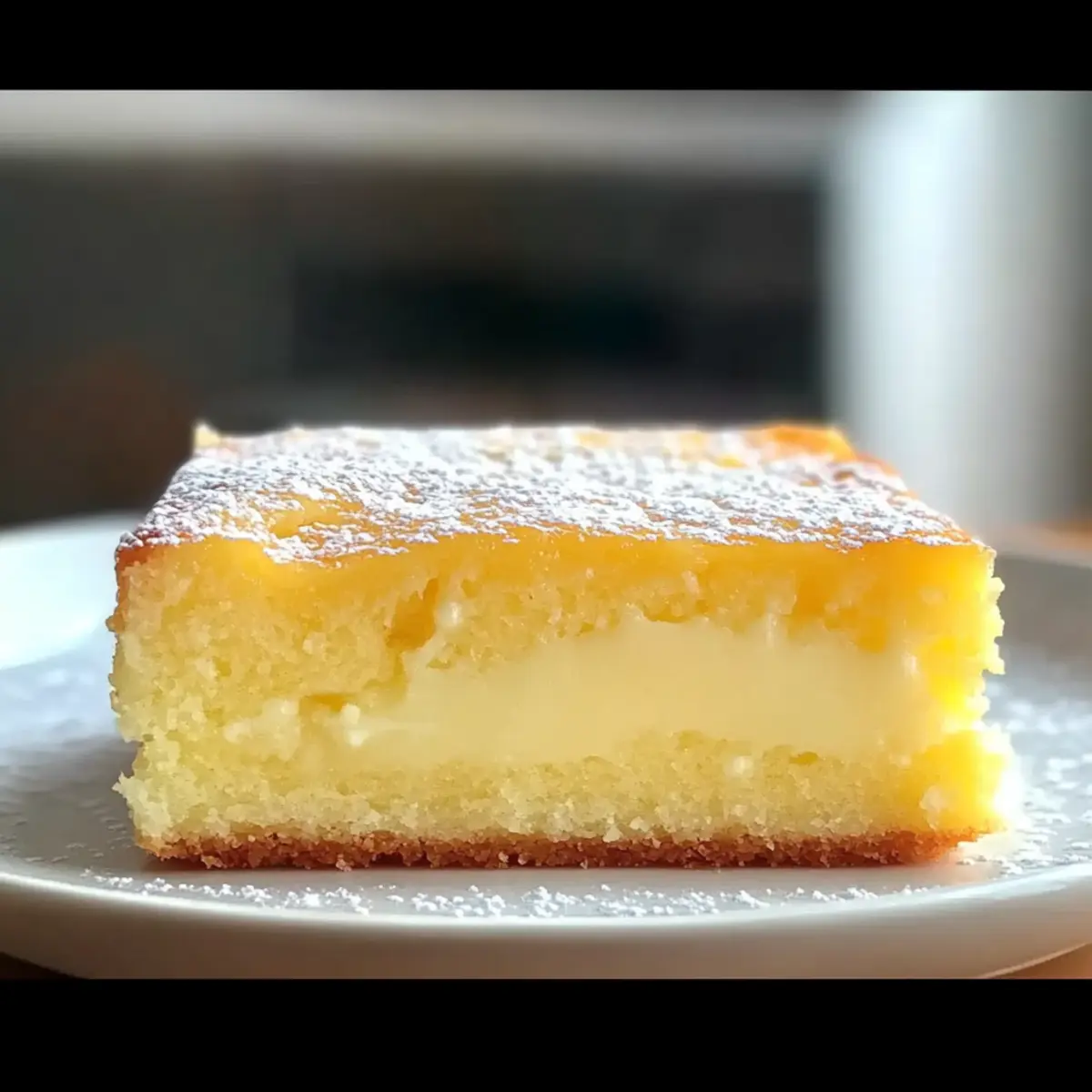 - Cut the Lemon Custard Cake into squares and dust with powdered sugar before serving.