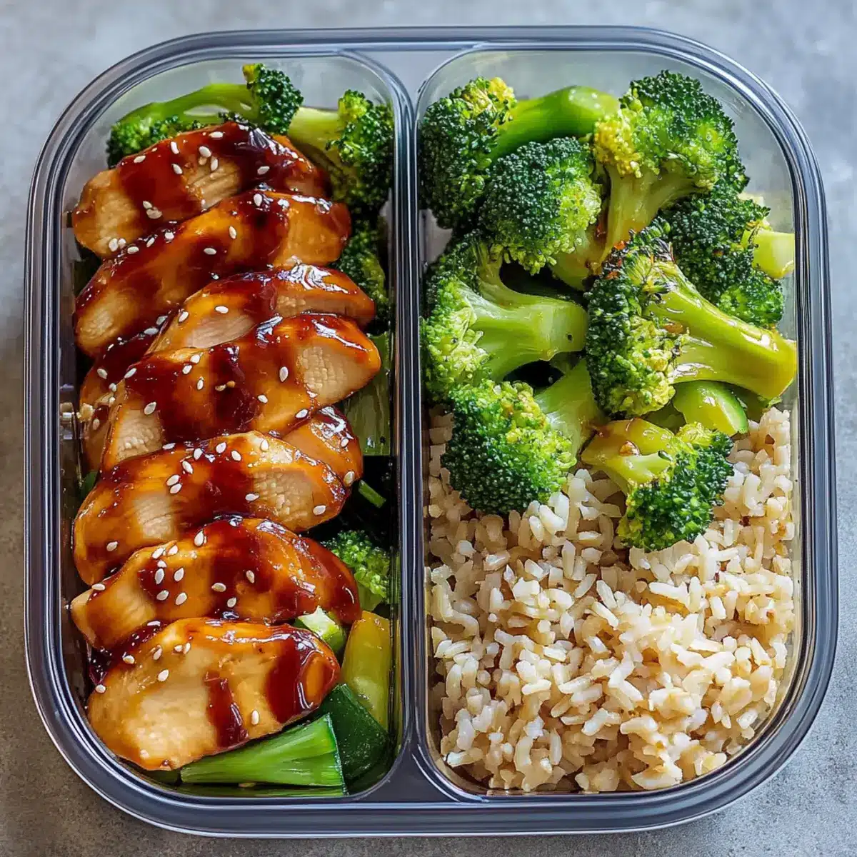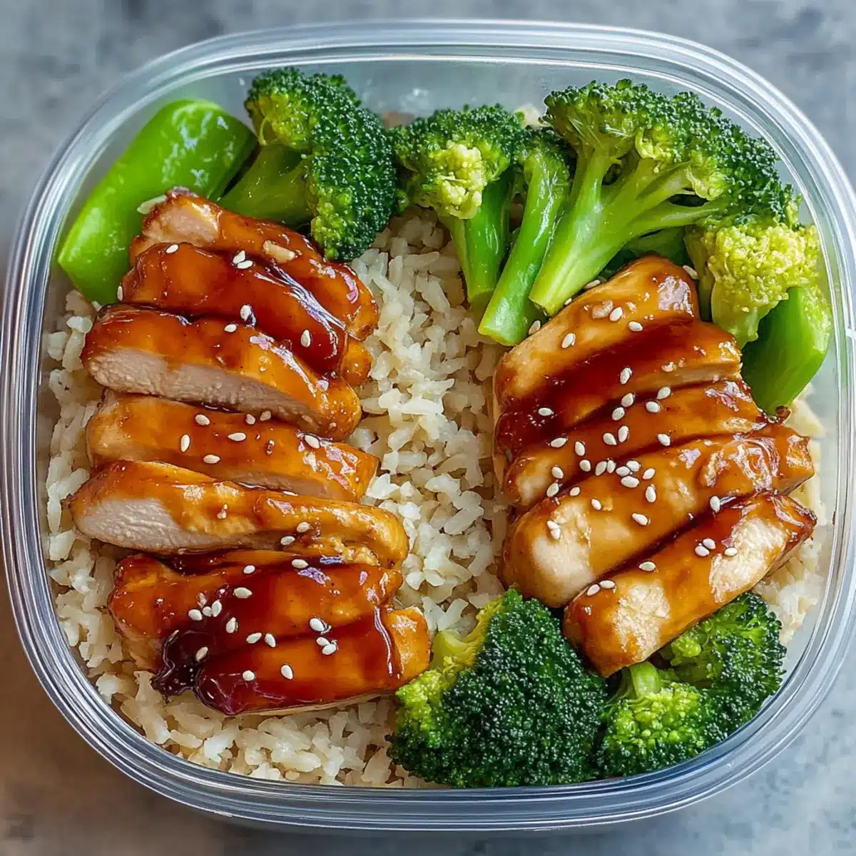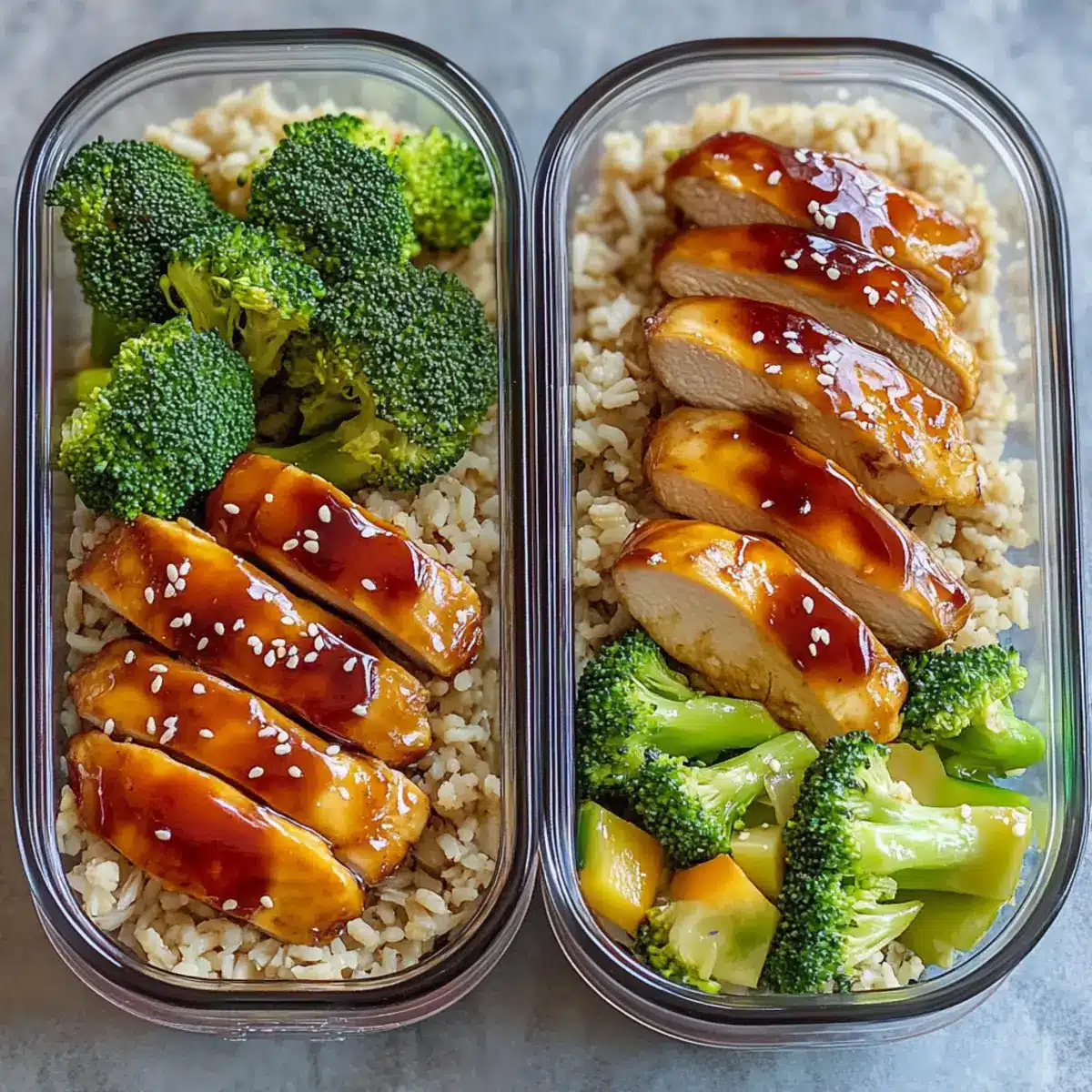 - Divide cooked brown rice or quinoa among meal prep containers, top with teriyaki chicken, sautéed vegetables, and sprinkle sesame seeds over each serving.