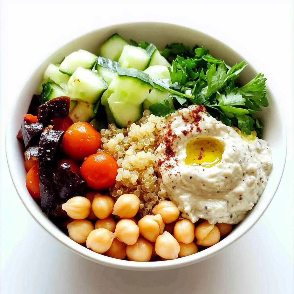 Yes! While it’s not ideal to freeze the entire bowl, you can definitely freeze the hummus and cooked quinoa. Place them in airtight containers or freezer bags for up to 3 months. When you’re ready to use them, simply thaw them in the fridge overnight, then give them a gentle stir before incorporating them into your salad!