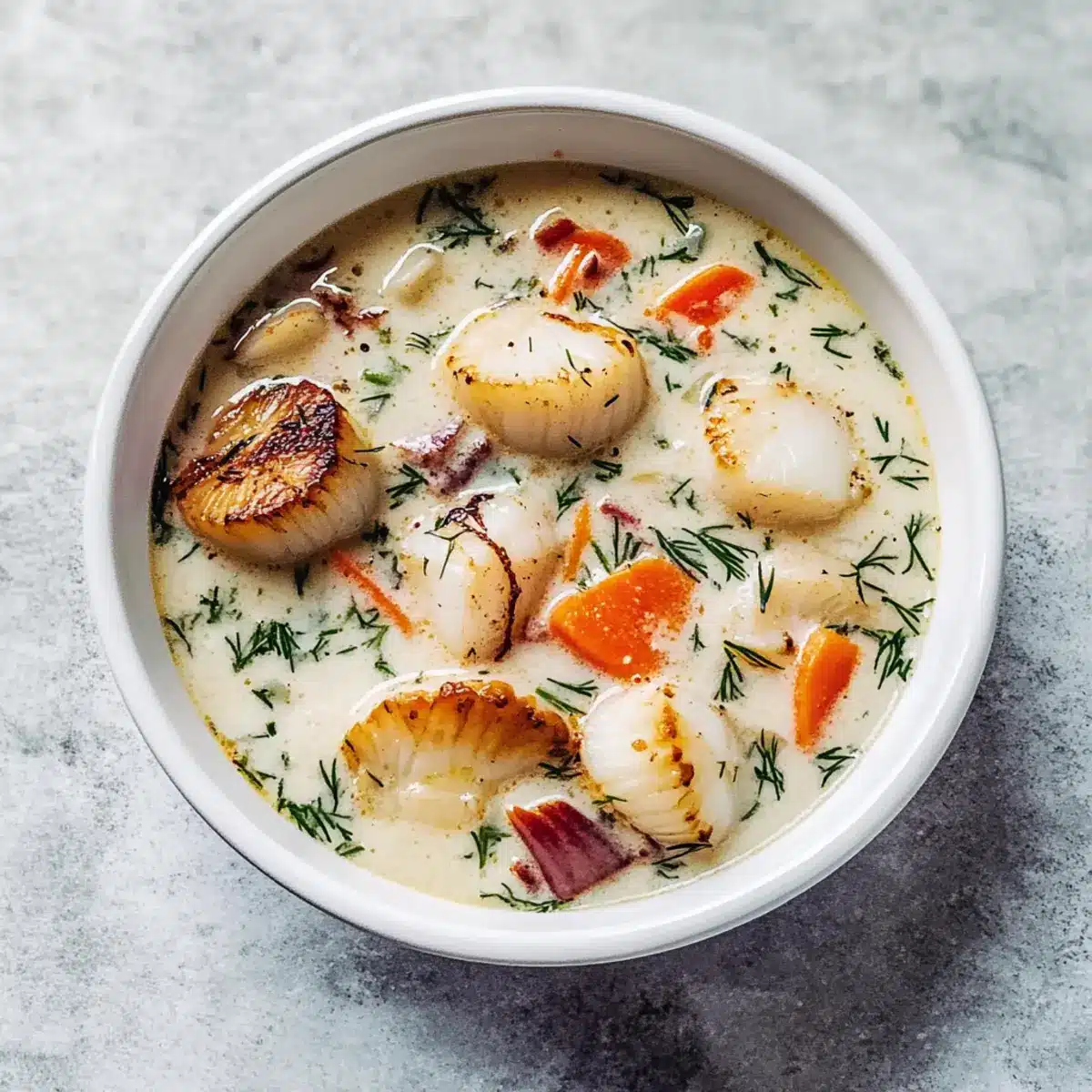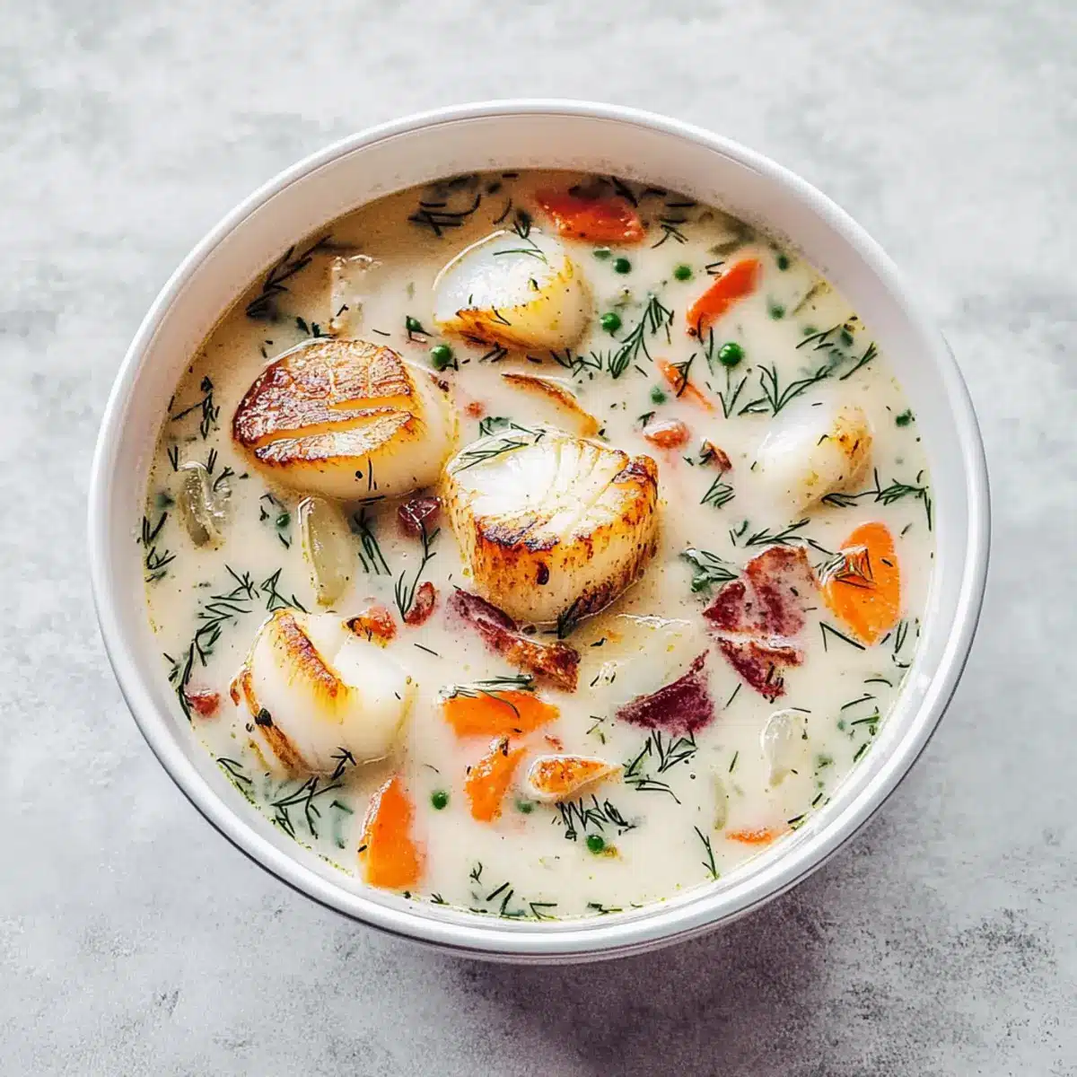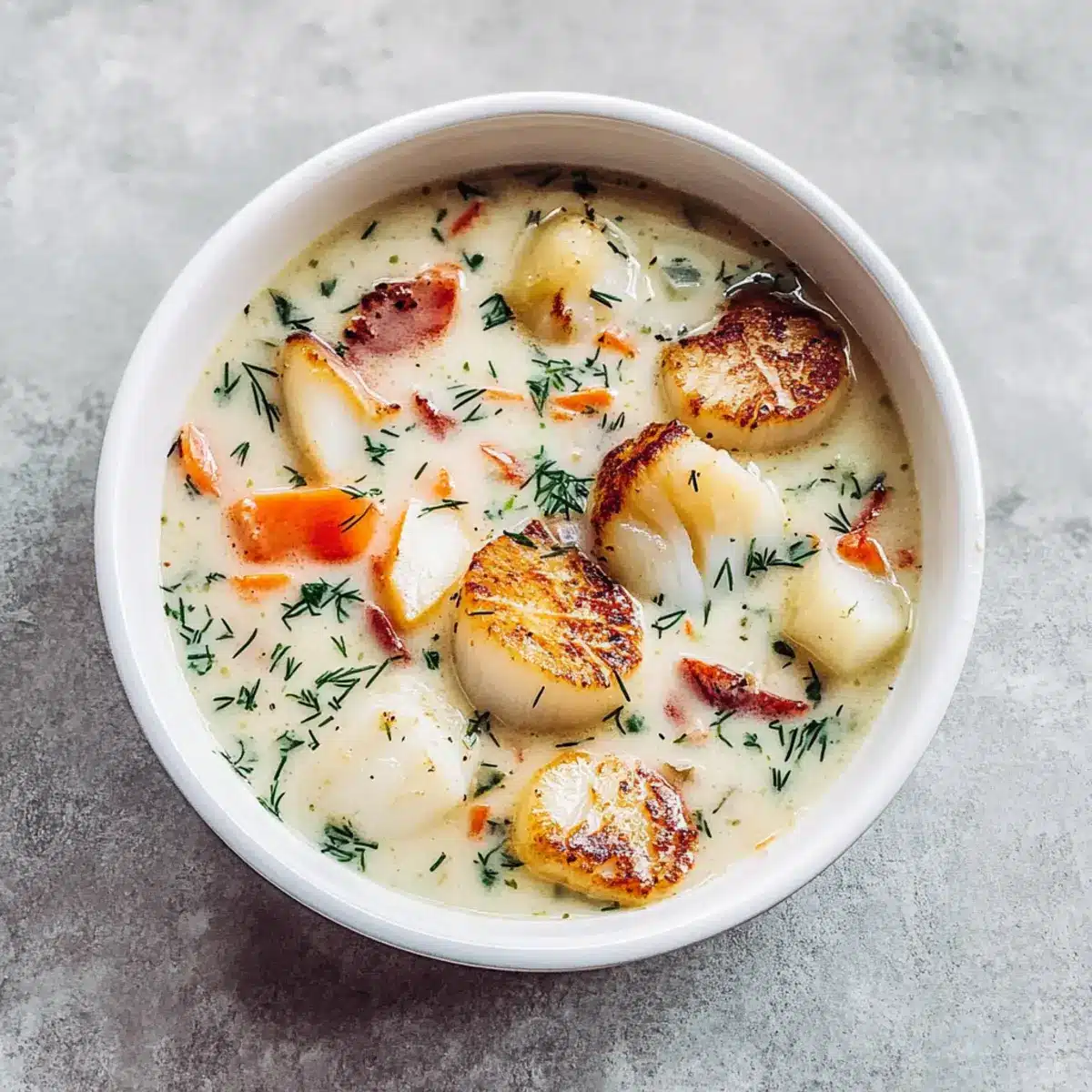 Mix the crispy bacon bits back into the chowder along with the chopped chives, dill, black pepper, and the remaining salt. Stir to combine, adjusting seasoning to taste. Serve your chowder hot, garnishing each bowl with the beautifully seared scallops and a sprinkle of fresh dill for a vibrant finish.