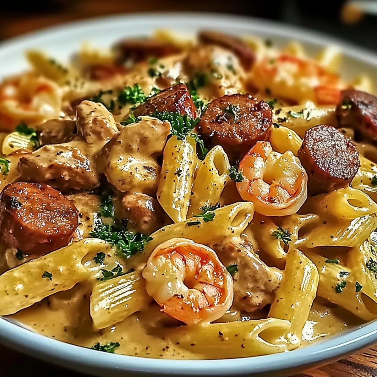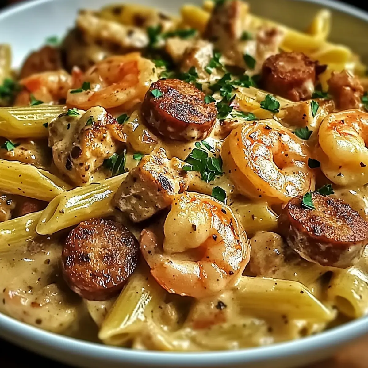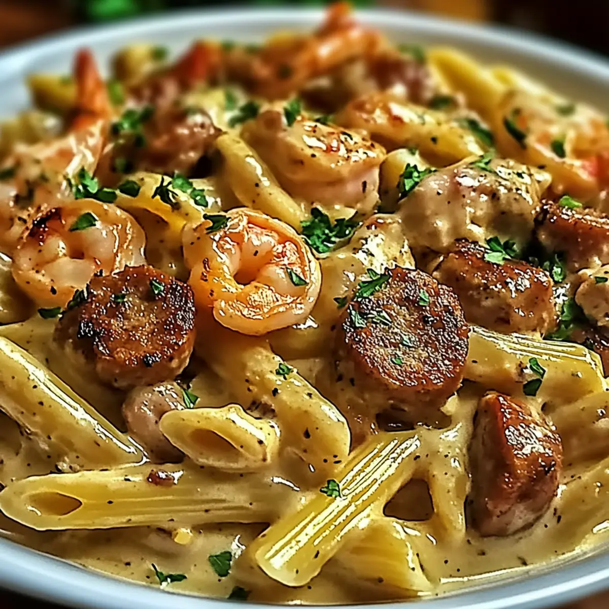 Return the cooked chicken, shrimp, and drained penne pasta to the skillet with the creamy sauce. Toss everything together thoroughly, ensuring the pasta is well-coated in the luscious sauce. Heat through for 1-2 minutes, allowing the flavors to meld beautifully while keeping an eye on the pasta to prevent overcooking.