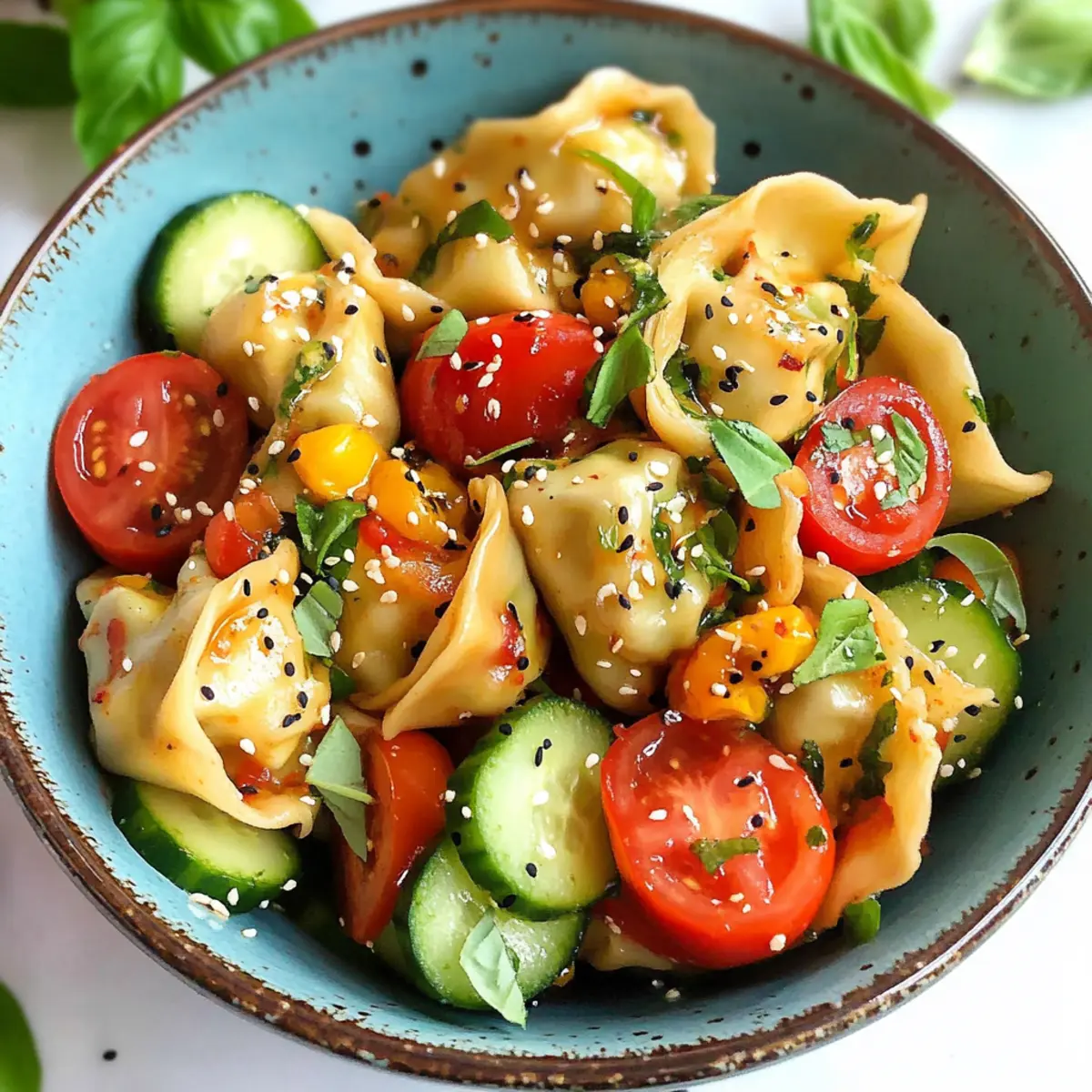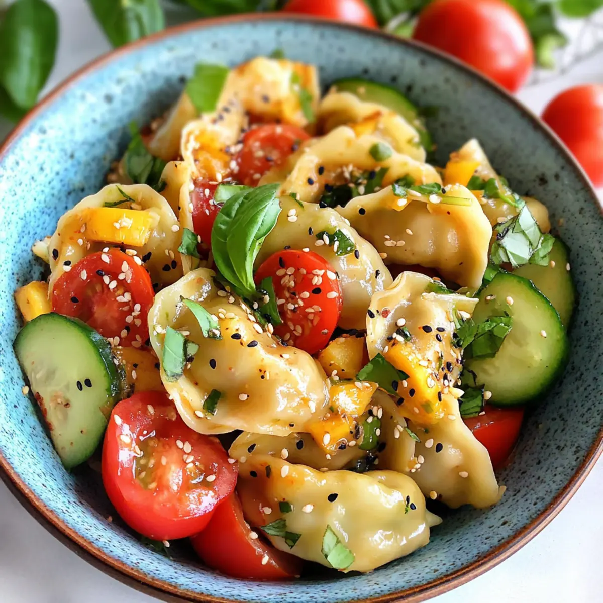 - Once the dumplings are cooked, add them to the bowl with your chopped vegetables. Pour the dressing over the dumplings and veggies, gently tossing everything together until evenly coated.
