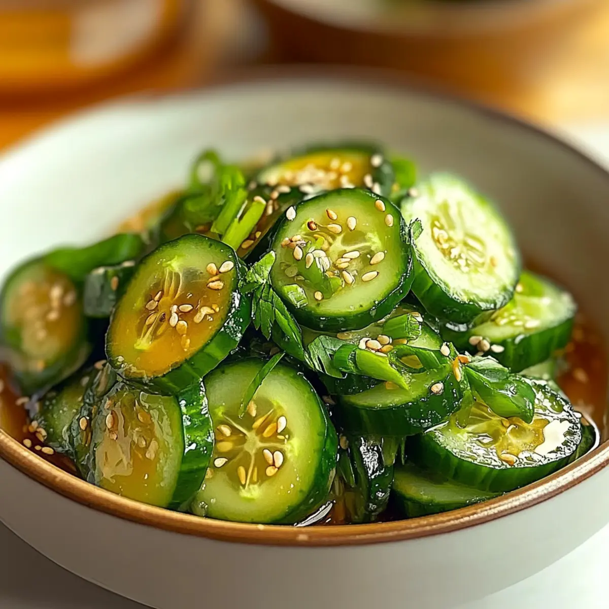 To amplify the flavor profile of your refreshing Asian cucumber salad, sprinkle in a handful of chopped fresh herbs, either cilantro or mint depending on your preference. Next, add about 1 tablespoon of toasted sesame seeds for added crunch and a nutty finish. Toss the salad lightly once more to incorporate the herbs and sesame seeds, allowing their freshness to blend beautifully with the cucumbers.