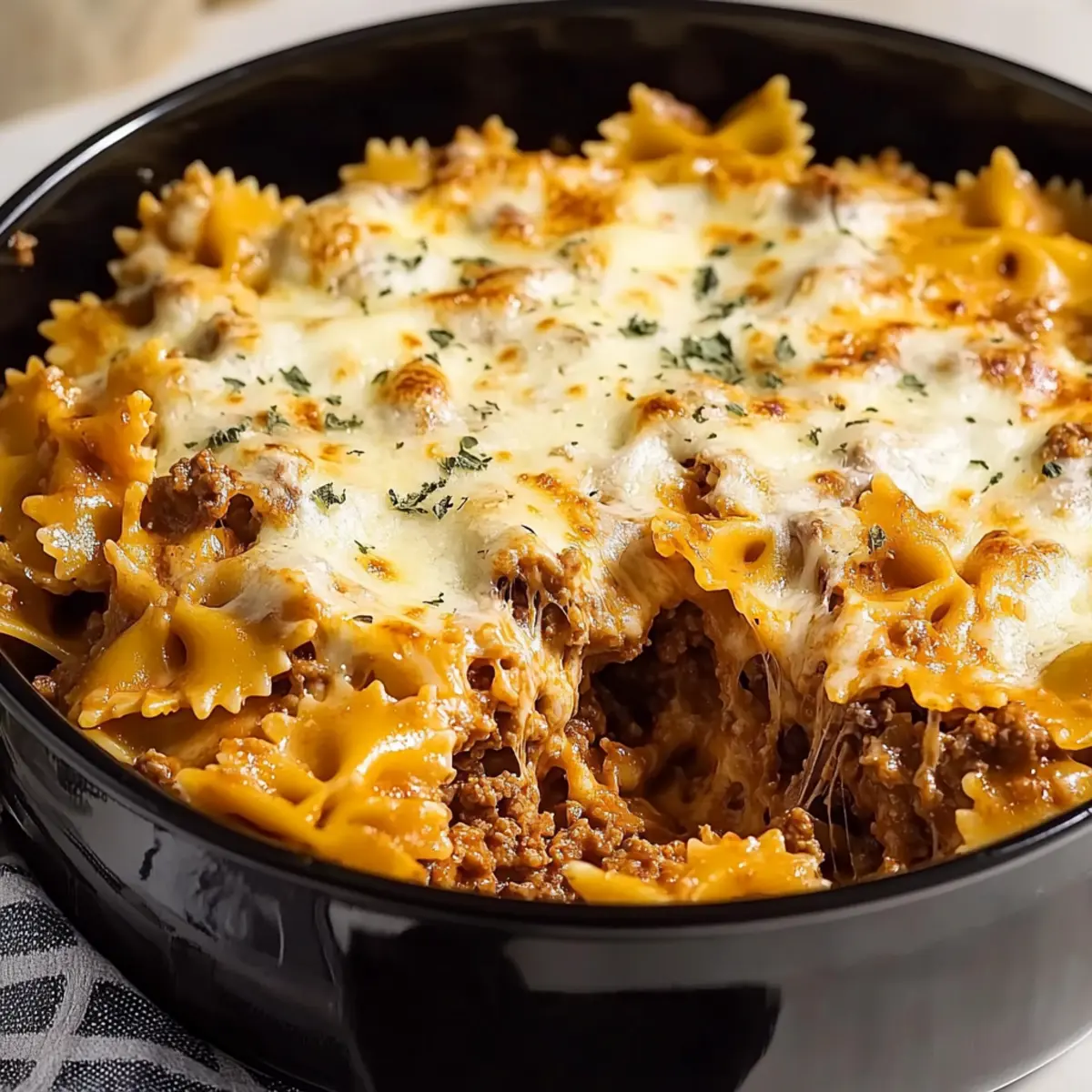 - In your slow cooker, pour half of the marinara sauce, then add half of the uncooked bowtie pasta. Layer with the cooked ground beef, followed by the cheese mixture.