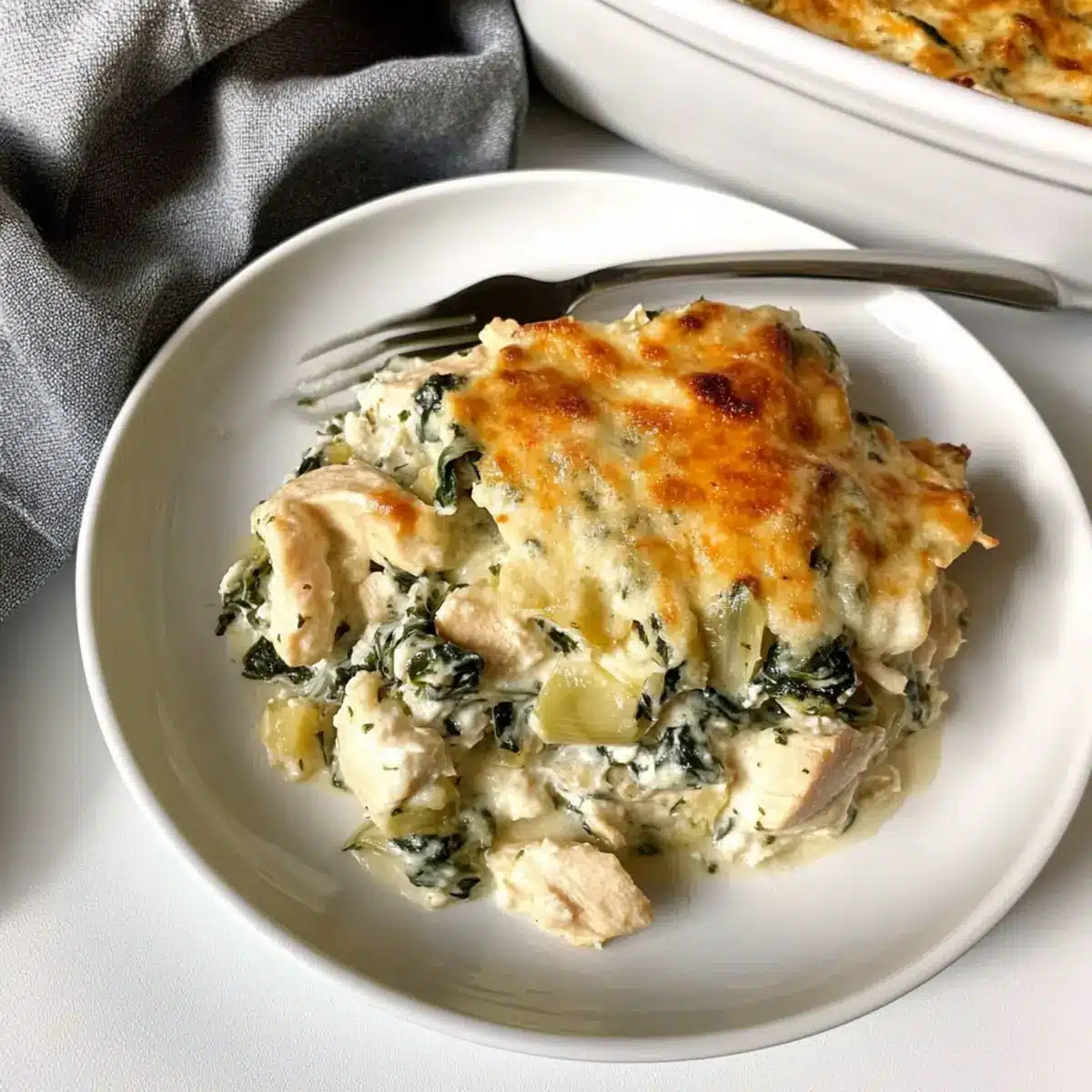 Once out of the oven, let your Spinach and Artichoke Chicken Casserole rest for a few minutes to set before serving. This resting period helps the casserole maintain its shape when spooned onto plates, allowing for an appealing presentation at your family meal.