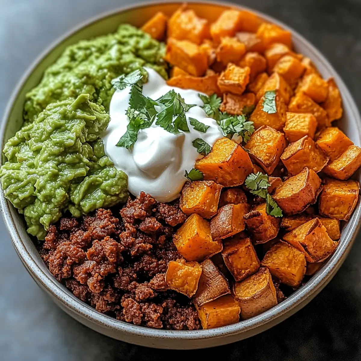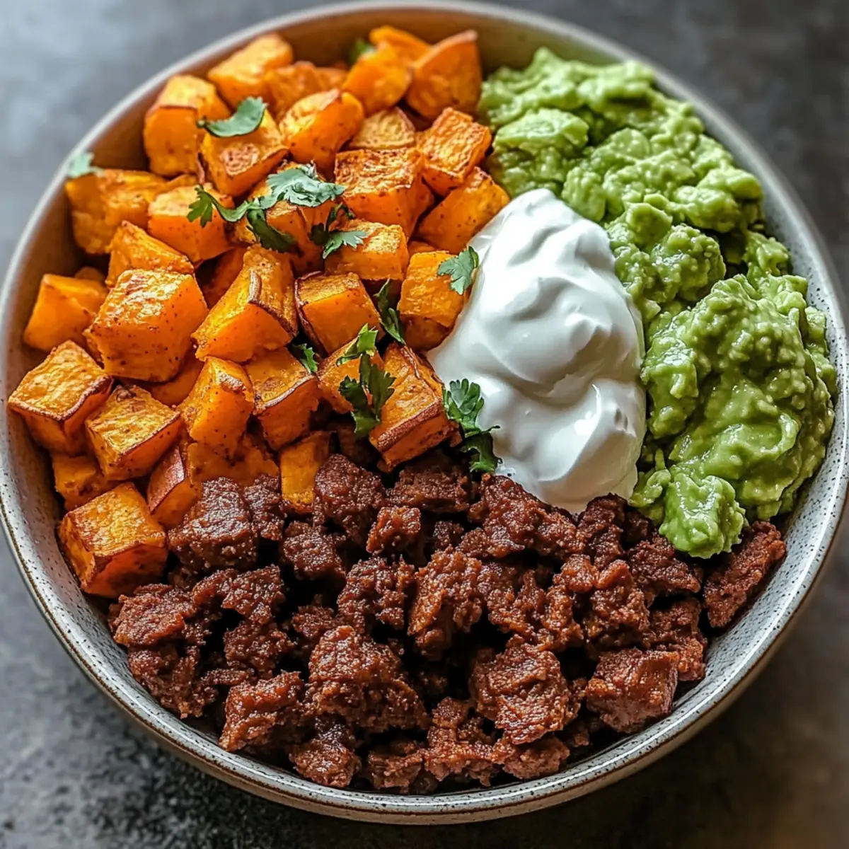 - Assemble your bowls by layering roasted sweet potatoes, taco beef, pico de gallo, guacamole, and sour cream.