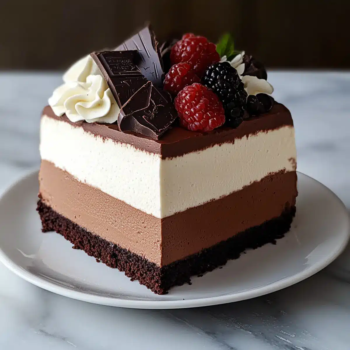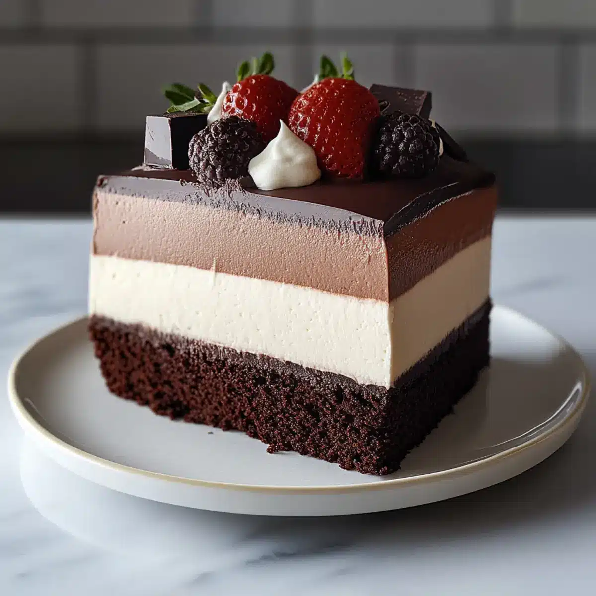 I once found myself gazing at the most exquisite dessert in a quaint café—each layer whispering sweet promises of dark, milk, and white chocolate. This moment of temptation sparked my passion for creating that indulgent experience at home, leading me to craft the perfect Triple Chocolate Mousse Cake. This no-bake beauty isn’t just a feast for the eyes; it’s also a wonderful crowd-pleaser, sure to dazzle friends and family at any gathering. Plus, it’s gluten-sensitive friendly and can even be made vegan, making it easy for everyone to indulge without worry. As each creamy layer melts away in your mouth, you’ll wonder how something so luxurious can be so simple to prepare. Ready to transform your kitchen into a chocolate lover’s paradise? Let’s dive in!