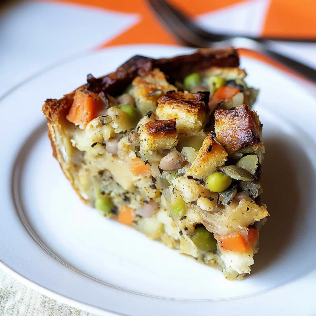 - Pour filling into pie crust and layer vegan stuffing on top.
